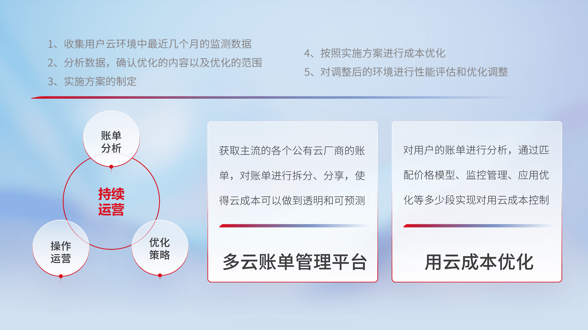 通过多云纳管,,以统一的资源数据模型把客户的云资源进行抽象和封装,,,,进而实现对多云资源的统一操作,,,,保障云资源管理的可靠性、、、稳定性与可用性。。。量身定制化运维内容,,配置、、开发运维、、、补丁管理、、、、备份、、监控、、、、认证和访问管理、、、审计和日常巡检等,,,,保障在用云过程中的可靠度,,,,稳定度以及高可用率。。。。
